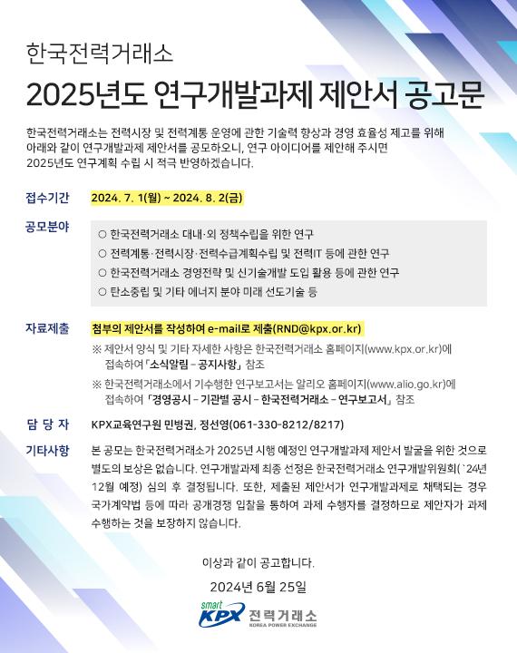 [안내]한국전력거래소 2025년도 연구개발과제 제안서 공고문