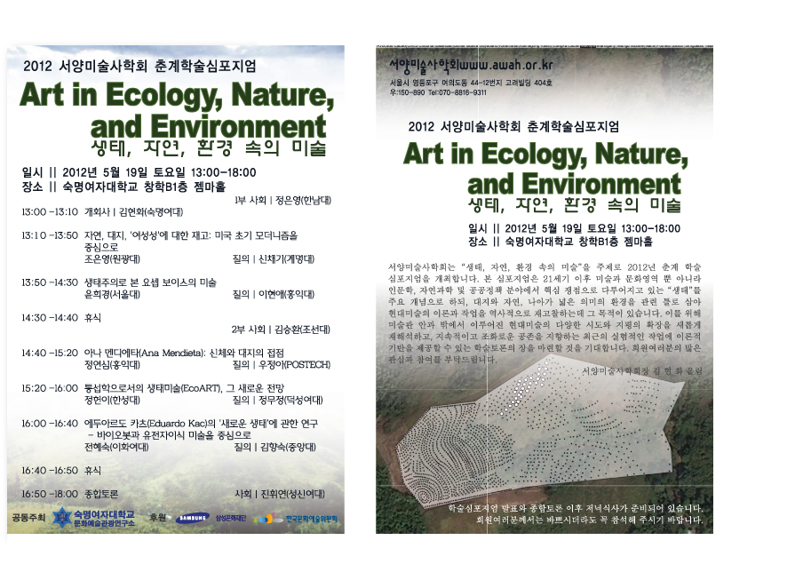 서양미술사학회는 “생태, 자연, 환경 속의 미술”을 주제로 2012년 춘계 학술 심포지엄을 개최합니다. 본 심포지엄은 21세기 이후 미술과 문화영역 뿐 아니라 인문학, 자연과학 및 공공정책 분야에서 핵심 쟁점으로 다루어지고 있는 “생태”를 주요 개념으로 하되, 대지와 자연, 나아가 넓은 의미의 환경을 관련 틀로 삼아 현대미술의 이론과 작업을 역사적으로 재 고찰하는데 그 목적이 있습니다. 이를 위해 미술관 안과 밖에서 이루어진 현대미술의 다양한 시도와 지평의 확장을 새롭게 재해석하고, 지속적이고 조화로운 공존을 지향하는 최근의 실험적인 작업에 이론적 기반을 제공할 수 있는 학술토론의 장을 마련할 것을 기대합니다. 회원여러분의 많은 관심과 참여를 부탁드립니다.