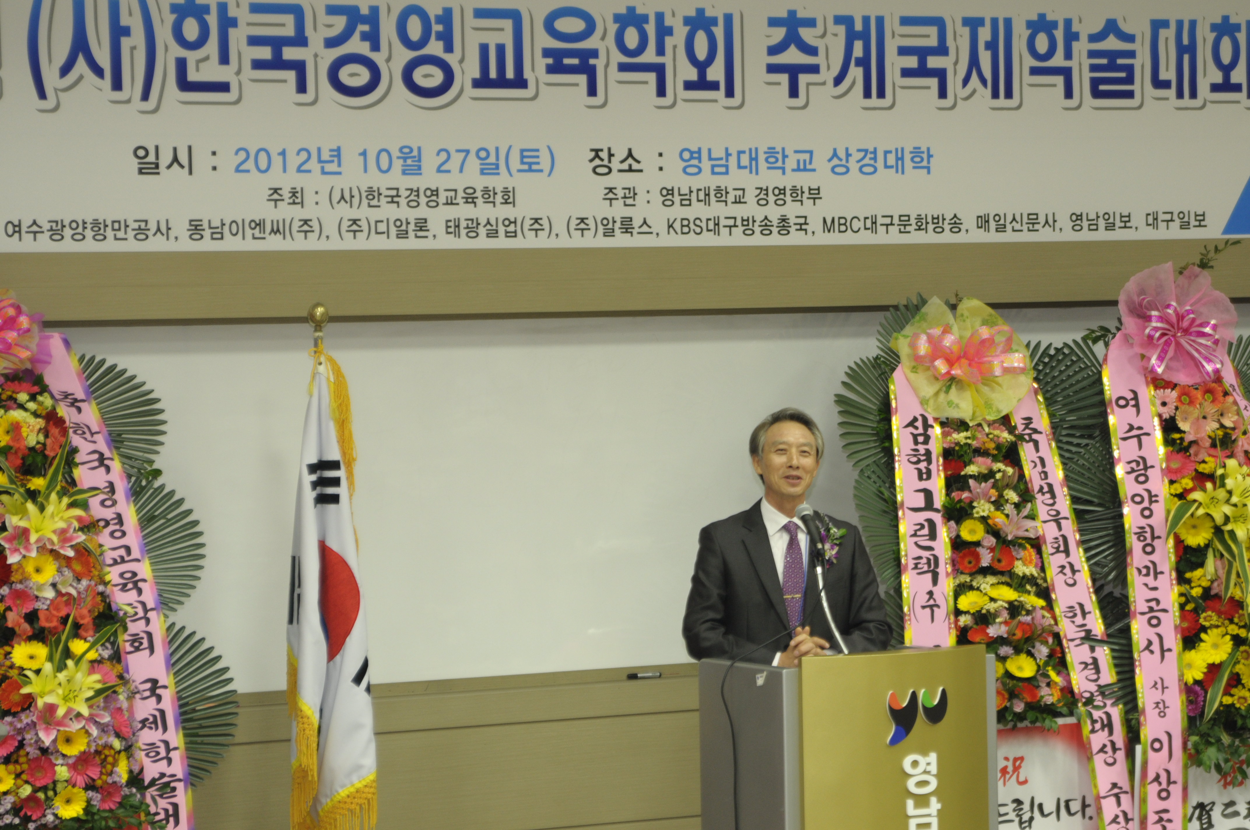 한국경영교육학회 추계 국제학술대회 영남대학교에서 열려 기사입력 : 2012년10월29일 21시12분 (아시아뉴스통신=김영수 기자) http://www.anewsa.com/detail.php?number=408988&thread=09r02 한국경영교육학회(회장 허익구⋅경남과학기술대학교 교수)는 27일 오후 1시부터 7시까지 ‘2012년 추계국제학술대회’를 영남대학교 상경대학에서 개최했다. 이날 행사에는 대만 Hsing Wu 대학교의 Kui Fen Lu 교수와 한국의 경영학을 공부하기 위해 동서대학교에서 연구중인 최화위 연구원 등의 외국인 회원들과 전국의 경영교육학회 회원 200여 명이 참석한 가운데 9개 분과로 나누어 경영 회계 관련분야의 논문 43편이 발표됐다. 특히 이날 학술 발표대회의 개회식에서 학회가 수여하는 최고의 영예인 한국경영대상에 삼협그린텍(주)의 김성우 회장과 최고경영자상에 여수 광양 항만공사 이상조 사장, 사회공헌대상에 동남이엔씨(주)의 김철문 회장, 경영혁신상에 (주)디알론의 배용대 사장에게 수여됐다. 삼협그린텍(주)의 김성우 회장은 수상소감에서 “녹색성장을 위해 ‘폐기물을 자원으로’라는 회사의 슬로건에 손색이 없도록 사회에 기여하는 기업인이 되겠다”고 다짐하고 “한국경영교육에 힘이 될 수 있는 일이 있다면 기꺼이 동참하겠다”는 의사를 밝혔다. 또한 이상조 여수광양항만공사 사장은 “교육이 바로서야 국가가 바로 선다.”라고 말하고 “한국경영교육학회의 발전이 국가발전의 원동력이 되기를 기대한다”고 수상 소감을 말했다.