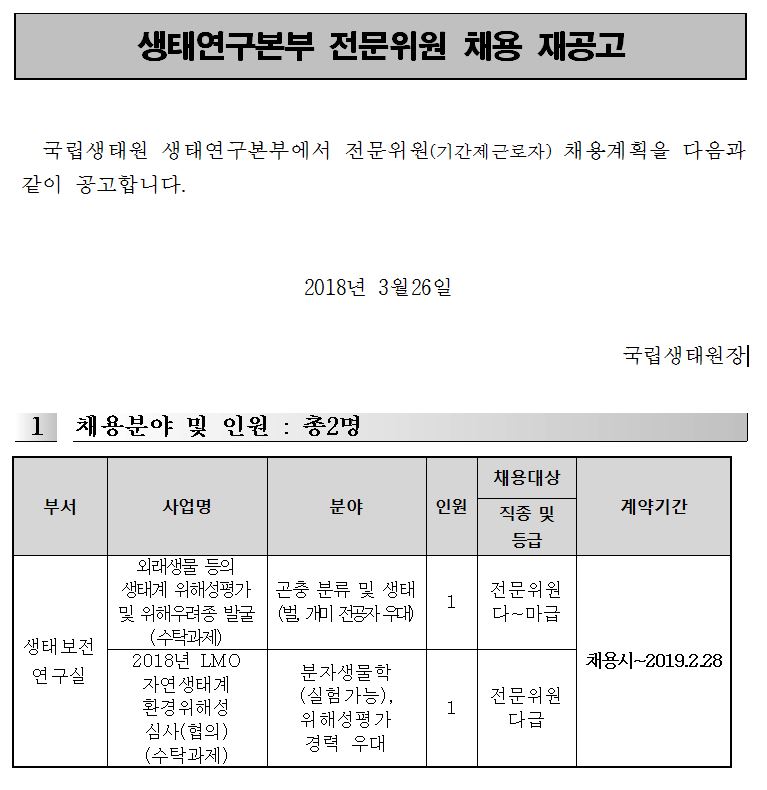 3. 근무처 및 보수 가. 근 무 처 : 국립생태원(충청남도 서천군 마서면 송내리 소재) 나. 보 수 : 국립생태원 내부규정에 따름 ※ 전문위원(가급 3,136,890원, 나급 2,800,870 급 2,504,050 라급,2.182.500 원,마급 1,914,400) ※ 4대보험 가입 및 시간외 수당 별도 지급 4. 시험방법 및 합격자 발표 가. 1차 : 서류전형 ○ 방법 : 응시자가 제출한 제반 서류를 토대로 응시요건 적합여부 및 기본 자질을 심사하여 3배수 이내 선발 ○ 서류전형 합격자 발표 : 2018.4.9(월) (합격자에 한해 E-mail 또는 SMS 개별 통보) 나. 2차 : 면접시험 ○ 면접일자 : 2018.4.12(목)예정 ○ 방법 : 공공기관 직원으로서 정신자세, 전문지식과 그 응용능력, 의사 표현의 정확성과 논리성, 예의․품행 및 성실성, 창의력․의지력 및 발전 가능성 등 응시자의 인성 및 자질평가 ○ 면접전형 합격자 발표 : 2018.4.13 17:00 이후 예정 (합격자에 한해 E-mail 또는 SMS 개별 통보) ※ 최종 합격자 발표일은 기관 내부사정에 따라 조정될 수 있음 ○ 면접시험 성적우수자 중 결격사유가 없는 자 채용 결정 ※ 단, 최종합격자가 근무를 포기하는 등의 사유로 추가 결원 보충이 필요한 경우 차순위 합격자를 1개월 이내 추가합격자로 결정할 수 있음 ○ 결격사유 조회 : 2018.4.13(금) 이후 예정 ○ 최종임용 : 2018.4.17.(화) 예정 5. 제출 서류 가. 응시원서 및 자기소개서(소정양식) 각 1부. 나. 학위논문요약서 및 연구실적목록 (소정양식)각 1부.(근거자료 등 이메일로 제출 가능, hk0729@nie.re.kr) 다. 최종학위증명서 사본 1부.(서류합격자에 한함) 라. 경력증명서 사본 1부.(서류합격자에 한함) 마. 자격증명서 사본 1부(서류합격자에 한함, 소지자에 한함). 바. 개인정보이용 동의서 1부. 사. 기본증명서 사본 1부.(서류합격자에 한함) ※ 서류 합격자에 한해 증빙서류 누락 시 경력 및 자격 불인정 ※ 장애인 또는 보훈대상자인 경우 증빙서류 제출. 6.응시원서 교부 및 접수 가. 교부 및 접수기간 : 2018.3.26.(월)~2018.4.8(일) 나. 교부방법 : 국립생태원 홈페이지(www.nie.re.kr) 등의 공고문에서 응시원서를 다운받아 사용 다. 접수방법 : 이메일 제출(hk0729@nie.re.kr), 방문제출 또는 등기우편으로 송부 ○ 등기 및 방문접수 : 접수마감일의 17:00까지 접수처 도착분에 한함 라. 접수처 주소 : (33657) 충남 서천군 마서면 금강로 1210 국립생태원 생태연구본부 기간제근로자 채용담당자 앞 7.응시자 유의사항 가. 응시희망자는 전공분야 등 자격요건이 적합한지를 판단하여 원서를 접수하시기 바라며, 채용서류 반환을 요구하는 경우 반환 가능합니다. ■ 채용서류 반환청구 안내 - [채용절차의 공정화에 관한 법률]제11조(체용서류의 반환 등)에 의거 채용과정에서 직접 제출한 서류 일체를 반환청구 하실 수 있습니다. - 반환청구기간 : 구직자의 채용여부가 확정된 날 이후 30일까지 ※ 청구기간이 지난 채용서류는 [개인정보보호법]에 따라 파기됩니다. - 신청방법 : 채용서류 반환청구서(상기 법률 시행규칙 제3조 별지서식) 작성 후 신청 ※ 반드시 자필작성 및 자필서명(날인) - 전자우편(hk0729@nie.re.kr), 등기우편, 팩스(041-950-6136) 신청 ※ 전자우편은 JPG 또는 PDF 형태로 송부, 파일명은 (이름_생년월일)로 첨부 - 등기우편 : 충남 서천군 마서면 금강로 1210 국립생태원 생태연구본부 연구관리기획팀 - 문 의 : 국립생태원 생태연구본부 채용담당자 (041-950-5319) ※ 반환청구서를 접수한 날부터 14일 이내에 본인 확인 후 채용서류를 반환해 드립니다. ※ 직접 방문수령 등을 희망하는 경우 반환청구서에 기재해 주시기 바랍니다. ※ 위에 언급되지 않은 사항은[채용절차의 공정화에 관한 법률]을 따릅니다. 나. 제출된 서류에 기재된 사항이 사실과 다름이 발견될 경우에는 합격 또는 임용을 취소할 수 있습니다. 다. 응시자격에 국립생태원『무기계약 및 기간제근로자 관리체칙』제5조의 결격사유가 발생한 자는 합격되더라도 합격 또는 임용이 취소됩니다. 라. 응시원서에 E-mail과 휴대폰번호, 집전화번호 등 연락처를 반드시 기재하시기 바랍니다. 마. 우대사항(국가유공자, 독립유공자, 장애인, 의사상자 등)이 있을 경우 응시원서에 기재하고 서류합격자에 한하여 증빙서류를 제출해 주시기 바랍니다. 바. 응시원서의 기재착오 또는 누락, 자격미비자의 응시, 연락불능 등으로 인한 불이익은 일체 응시자의 책임입니다. 사. 본 시험일정은 사정에 의하여 변경될 수 있으며, 변경된 사항은 해당 시험일 3일 전까지 변경 공고됩니다. 아. 심사결과 적격자가 없는 분야는 전원 불합격 처리하거나 예정 인원보다 적은 인원을 채용할 수 있습니다. 자. 기타 자세한 내용은 국립생태원 생태연구본부 기간제근로자 채용담당자(☎041-950-5319, (hk0729@nie.re.kr)로 문의하여 주시기 바랍니다. 2018년 3월26일 국립생태원장 |