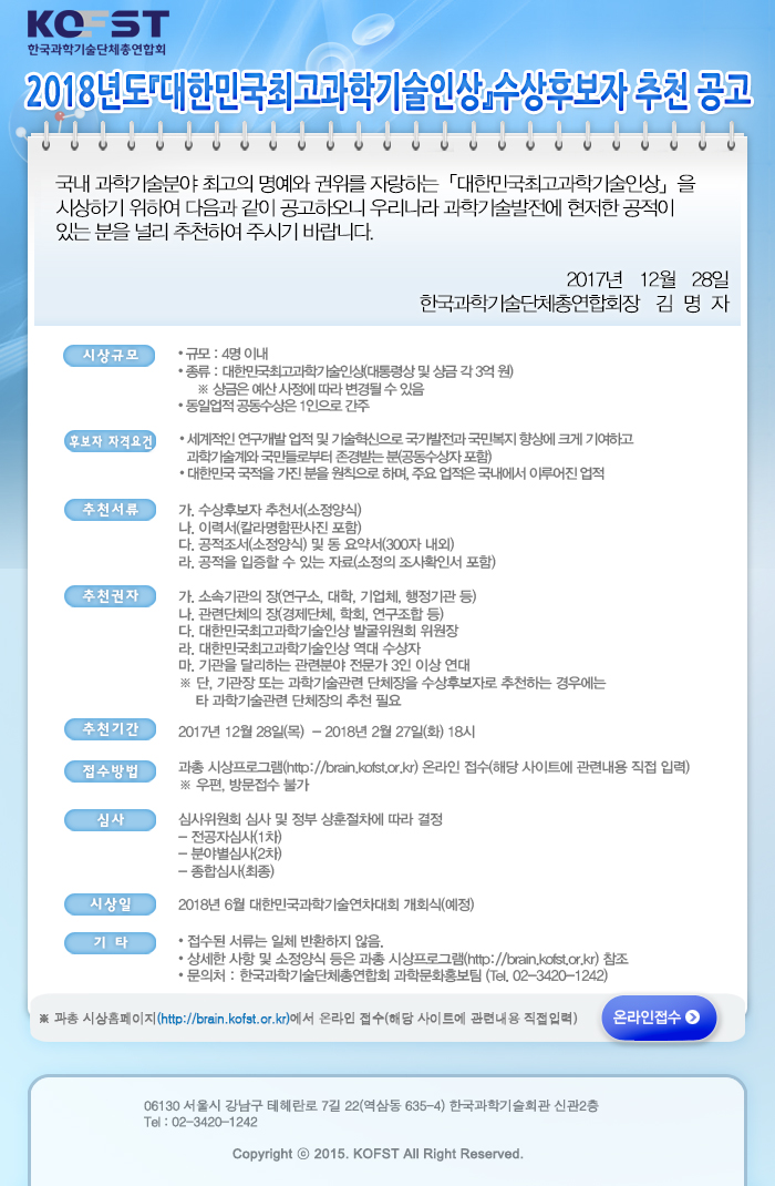 2018년「대한민국최고과학기술인상」수상후보자 추천공고