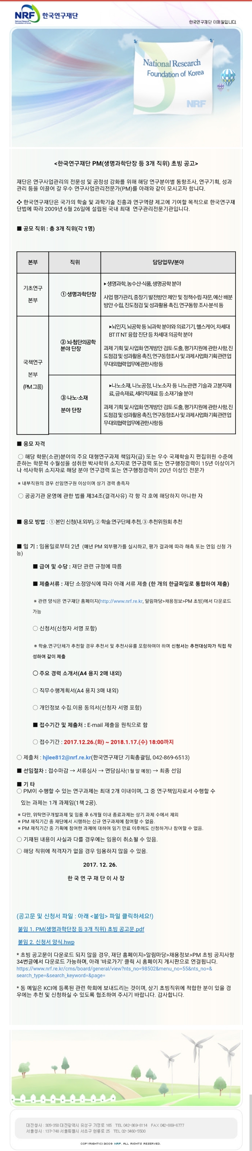 한국연구재단 PM(생명과학단장 등 3개 직위) 초빙 공고