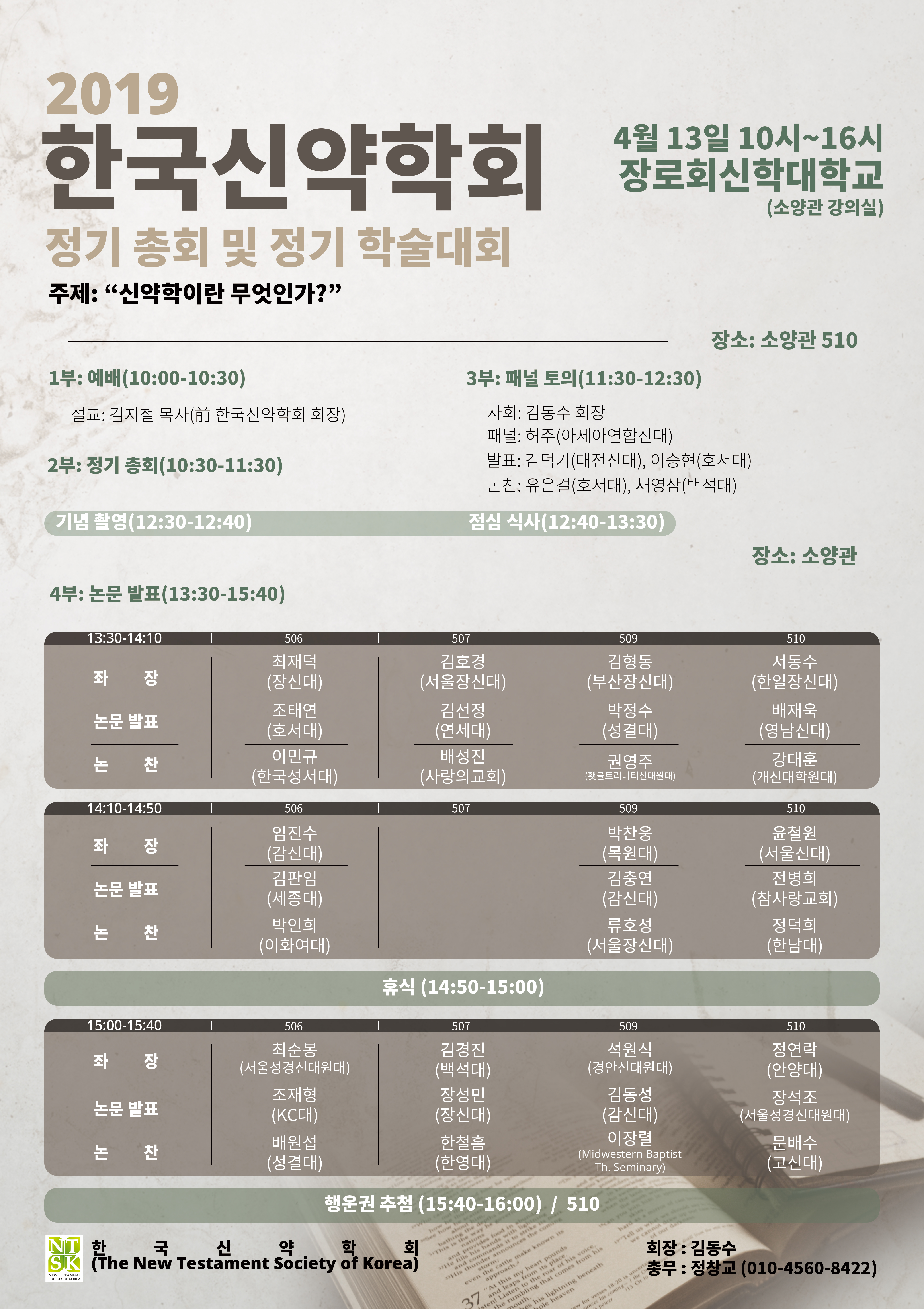 한국신약학회 정기 총회와 정기 논문발표회가 4월 13일(토) 장로회신학대학교에서 개최됩니다. 이번 행사를 위해 다양한 순서를 준비하였습니다.
